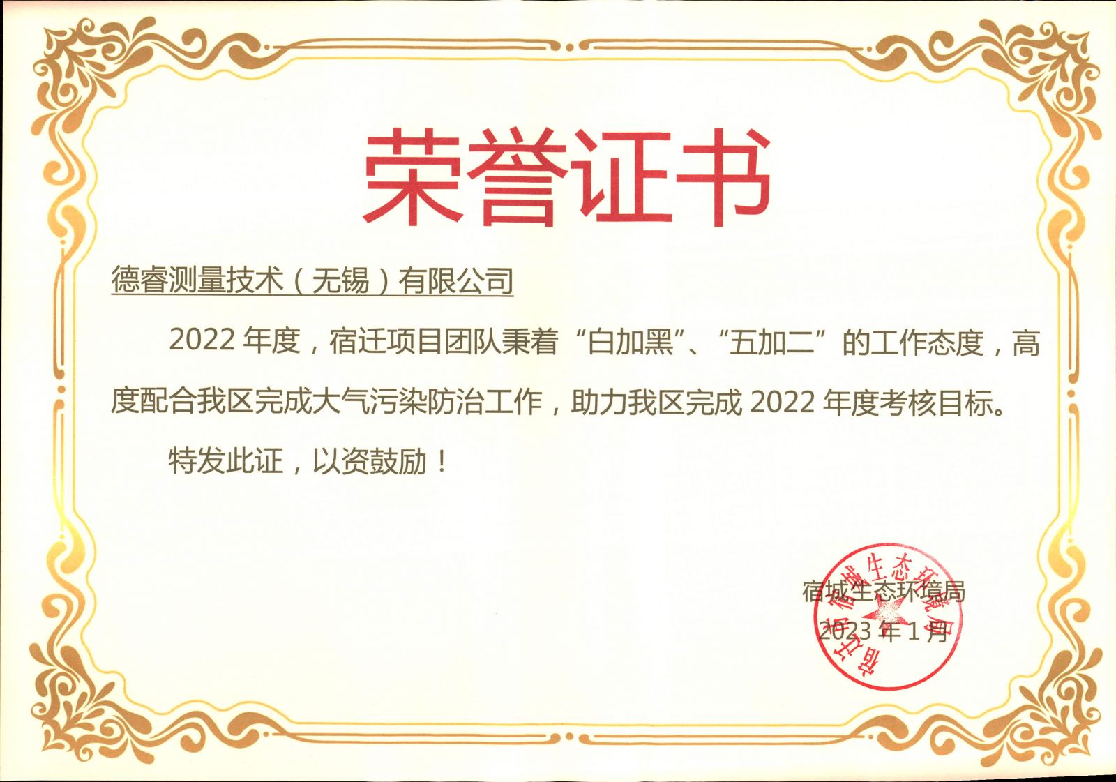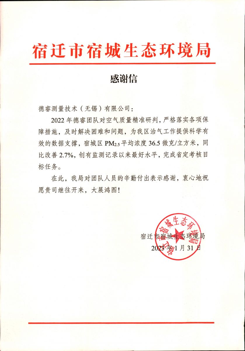 德睿測量技術(無錫)有限公司每年都會收到宿遷市宿城生態(tài)環(huán)境局的感謝信,充分肯定了團隊為宿遷市空氣質量改善所作出的積極貢獻。