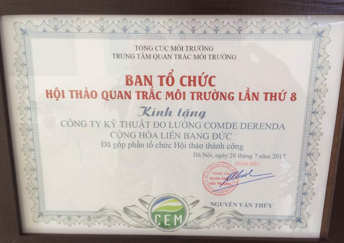越南環(huán)保部為了感謝德潤(rùn)達(dá)對(duì)越南環(huán)境監(jiān)測(cè)事業(yè)做出的貢獻(xiàn) ,特此頒發(fā)了榮譽(yù)證書。